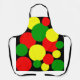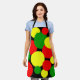 Whimsical apron designed using different sizes of red, yellow and green polka dots on a black background. Customers can move and resize each dot.