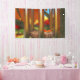 After the wind a single fallen leaf lies where it fell on a silent wind chime. On the ground beneath the still-green grass is covered with yellow and red leaves. In the background a crimson and gold autumn orchard reflects its colors in the silver bars of the chime.