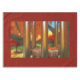 After the wind a single fallen leaf lies where it fell on a silent wind chime. On the ground beneath the still-green grass is covered with yellow and red leaves. In the background a crimson and gold autumn orchard reflects its colors in the silver bars of the chime.
