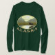 Somewhere in Alaska, perhaps in the Brooks Range, a moose strides through a pond on a sunny fall afternoon. As the end of the year approaches the light has taken on the typical yellowish tone that makes everything seem a bit brittle. The sun is dropping down between the mountains in the background. Text reading "Alaska" also appears.