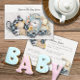The new mommy-to-be will love these paper napkins that feature cute stuffed animals with a checkered black and white tea kettle and teacups, vintage alarm clock, and a soft floral design wallpaper in the background. All text can be updated to meet your specific needs.