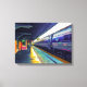 Afternoon Train, the title of the artwork on this Canvas Print, is original artwork by ZoeSPEAK, done in primary pastel colors. The shiny, silvery blue train is stopped at the station, where the yellow sunlight reaches the platform, and lights up the pink wall of the building.