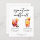 This refreshing afternoon signature cocktails menu sheet features simple black typography above 2 drinks and their ingredients for your wedding bar. A cute summer Sangria and Tequila sunrise drawing add a cool flair to your bar menu. Complete with the couple's names and date for their reception.