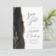 The left-hand edge of this elegant modern wedding save the date card features a black watercolor agate border trimmed with gold faux glitter. The customizable text combines charcoal gray handwriting, copperplate and italic fonts on a white background. The reverse side features a matching black and gold agate design.