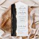 The left-hand edge of this elegant modern all-in-one wedding invitation and RSVP features a black watercolor agate border trimmed with faux gold glitter. The customizable text combines charcoal gray handwriting, copperplate and italic fonts on a white background. The return address appears on the outside flap and the reverse side of the detachable RSVP card in charcoal gray text on solid white.