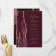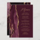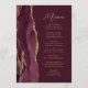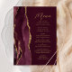 This elegant modern wedding menu features a burgundy red watercolor agate border trimmed with faux gold glitter. The customizable text combines gold-colored handwriting script and sans serif fonts on a burgundy background. The burgundy and gold agate design is repeated on the reverse side.