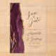 The left-hand edge of this elegant modern wedding save the date card features a burgundy red watercolor agate border trimmed with gold faux glitter. The customizable text combines charcoal gray handwriting, copperplate and italic fonts on a clear background.