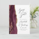 The left-hand edge of this elegant modern wedding save the date card features a burgundy red watercolor agate border trimmed with gold faux glitter. The customizable text combines charcoal gray handwriting, copperplate and italic fonts on a white background. The reverse side features a matching burgundy and gold agate design.
