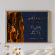 This elegant modern wedding welcome sign features a burnt orange watercolor agate design trimmed with faux gold glitter. Easily customize the gold-colored text on a navy blue background, with the names of the bride and groom in script calligraphy over a large, pale grayish blue ampersand.