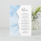 The left-hand edge of this elegant modern wedding menu features a baby blue watercolor agate border trimmed with faux silver glitter. The customizable text combines handwriting script and copperplate fonts in charcoal gray on a white background. The reverse side features a matching baby blue and silver agate design.