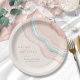 Not all wedding designs are created equal. The asymmetrical layouts for the pieces in this striking wedding set prove that's not a bad thing! Wavy bands of color in contrasting shades of rose gold blush and soft teal blue with a center of glittering crystal form a geode/agate accent on most pieces in the set. The coordinating wedding paper plate shown here features a large geode/agate angled to one side and your text on the other. Easily add your names, wedding date and personal 'thank you' message using the provided template. Search ID647 to see all the coordinating pieces in this set.