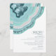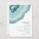 Not all wedding designs are created equal. The asymmetrical layouts for the pieces in this striking wedding set prove that's not a bad thing! Wavy bands of color in contrasting shades of teal blue and blush pink with a center of glittering crystal form a geode/agate accent on most pieces in the set. The wedding 'Menu' card shown here features the above plus a template to add your pertinent wedding menu selections. The reverse also allows you to add the bride and groom's names and wedding date. Search ID647 to see all the coordinating pieces in this set.