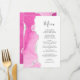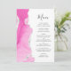 The left-hand edge of this elegant modern wedding menu features a pink watercolor agate border trimmed with faux silver foil. The customizable text combines handwriting script and copperplate fonts in charcoal gray on a white background. The reverse side features a matching pink and silver agate design.