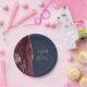 These elegant modern wedding plates feature a burgundy watercolor design trimmed with faux gold glitter. Easily customize the gold-colored text on a navy blue background, with the names of the bride and groom in handwriting calligraphy over a large ampersand.