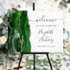 This elegant modern wedding welcome sign features a hunter green watercolor agate design trimmed with faux silver glitter. Easily customize the charcoal gray text, with the names of the bride and groom in handwriting calligraphy over a large, pale green ampersand.