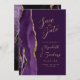 The left-hand edge of this elegant modern wedding save the date card features a purple blue watercolor agate border trimmed with gold faux glitter. The customizable text combines gold-colored handwriting, copperplate and italic fonts on a plum background. The reverse side features a matching purple and gold agate design.