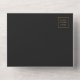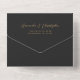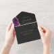 The left-hand edge of this elegant modern all-in-one wedding invitation and RSVP features a purple watercolor agate border trimmed with faux gold glitter. The customizable text combines gold-colored stylish calligraphy script and sans serif fonts on a slate black background. The return address appears on the outside flap and the reverse side of the detachable RSVP card in gold-colored text on solid slate black.