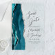 The left-hand edge of this elegant modern wedding save the date card features a teal blue watercolor agate border trimmed with silver faux glitter. The customizable text combines charcoal gray handwriting, copperplate and italic fonts on a clear background.