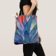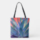 This colorful tote bag features a close-up view of a blue agave plant against a colorful desert sunset sky. This modern art abstract image features pretty shades of blue, green, teal, purple, pink, orange and peach. This tote is perfect for shopping, baby gear, a day at the beach, travel and much more. Click "Personalize this Template" to easily add optional text.