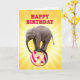 A baby elephant stands on a ball, while inside elephants are skateboarding! A happy elephant birthday card for a child age 2.