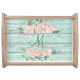 .: Pink Flower Blossoms floral wreath Farmhouse Decor Serving Tray. Rustic, hand-painted and painted watercolor artwork with an elegant hydrangea flower and eucalyptus pattern including brown and green and yellow foliage, gold-colored frame, branches over a rustic, distressed, reclaimed, vintage cottage green weathered barn wood background.