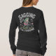 A funny illustration of an older, anthropomorphic frog wearing a pink dress and using a walker, accompanied by the bold humorous phrase “Sagging but still gagging.” The design blends playful cartoon style with cheeky humor.