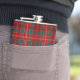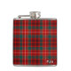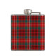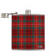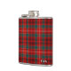 Monogrammed flask with the family tartan of Clan Ainslie. Bright red and forest green Scottish plaid pattern, with yellow, black, and white accents.