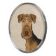 Destei's original cartoon illustration of an adorable Airedale Terrier breed dog's head close-up. The background color is beige with a decorative texture. The background color can be changed to any other color and the texture can be removed, if so wished. On the other side there is a personalizable text area for a name or other custom text.
