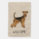 Destei's original cartoon illustration of a cute Airedale Terrier breed dog. The background color is beige with a decorative texture. The texture can be removed and the background color can be changed to any other color, if so wished. There is also a personalizable text area that now reads: "Welcome".