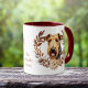 A pretty autumn wreath in tones of cinnamon brown, tan, and cream surround the watercolor image of an Airedale Terrier Dog. The image is printed twice on the mug, with your custom text between them.