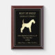A gold silhouette of an Airedale Terrier dog on a dramatic black background is the center of this dog show award plaque. Your custom text is in gold in six easy to customize fields above and below the image. Easily change this to the appropriate class or group award. And, if the award is ordered after the show as a tribute to your own dog, you can replace the judge's name on the last line with the dog's registered name.