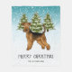 Destei's original cartoon illustration of a cute Airedale Terrier breed dog. The dog is placed in a winter scene with three green fir trees and falling snow. The background is a blue to white gradient giving the design that cold winter day look. There is also a personalizable text area that now reads "Merry Christmas!". Under it is another personalizable text area for a family name or other custom text.