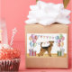 Destei's original cartoon illustration of a cute Airedale Terrier breed dog. The dog is placed in a colorful birthday setting with pastel color birthday balloons, gifts and a bunting banner. The pastel colors include pink, green, blue, red, orange and purple. The dog is standing on a yellow wood floor texture and the background has a playful pastel color polka dot pattern.