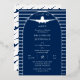 Your favorite pilot getting ready to soar with the eagles? Celebrate your graduate's accomplishment in true aviation style with this real silver foil, blue and white graduation party invitation design by Holiday Hearts Designs. The "Class of" and "Year" text as well as the graduate's name are in silver foil. The dark blue arch is outlined in silver foil and the front background features silver foil and dark blue stripes. The back features a repeat pattern of dark blue airplanes on a white background.