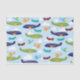 A patter with vintage style fighter planes, helicopters and passenger jets. The background is a soft blue sky with clouds. This tissue is perfect for a transportation, airplane or aviation theme birthday party.