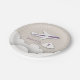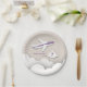 Birthday party plates featuring an illustration of an airplane with a purple stripe flying above the clouds. Personalize the name and age.