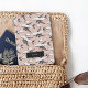 Cute travel themed passport holder features a sketched pattern of airplanes and clouds in black and white on a blush pink background. Customize with your name or choice of personalization on a black and white rectangle along the bottom.