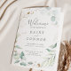 This airy greenery and gold leaf folded wedding program is perfect for a modern wedding. The elegant botanical design features light and airy watercolor eucalyptus accented with whimsical gold glitter leaves.