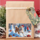 A heartwarming holiday illustration featuring a cheerful dog playing in the snow, wearing a Santa hat and surrounded by colorful gift boxes. In the background, children build a snowman beside a snow-covered Christmas tree, creating a joyful winter wonderland. Perfect for spreading holiday cheer and capturing the magic of Christmas.