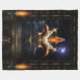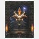 This fractal art composition consist of 139 fractal objects that are arranged to create what looks like a metal clad picture frame with to fire urns on the sides and within the picture frame is an orb winged object the floats above a pedestal with wispy clouds and a blue moon in the background.