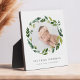 Chic photo plaque frames a favorite horizontal or landscape oriented photo of your sweet little one with an oval wreath of green watercolor foliage and white flowers. Personalize with baby's name and birth stats beneath for a unique and elegant keepsake for new parents.