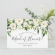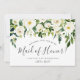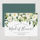 Chic floral bridal party proposal card features a top border of ivory roses and white peonies with lush botanical foliage and greenery. Personalize with your maid of honor request details (shown with "will you be my maid of honor? I can't say I do without you") in modern hand lettered script and traditional sans serif lettering. Invitations reverse to rich jewel toned jasper green.