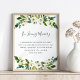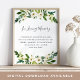 Designed to match our Alabaster Floral wedding collection, this elegant botanical sign is perfect for placing at a memorial table or display honoring loved ones who have passed. Personalize the header and body text (shown with "In Loving Memory" and a brief poem) framed by lush watercolor greenery and white flowers.