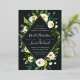 Our Alabaster wedding invitation frames your wedding details with painted watercolor greenery and foliage dotted with white peonies and roses. A modern yet organic choice in green and white with lush botanicals and handwritten lettering on a rich off-black background. Gold foil trim completes the design for a luxe look.