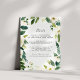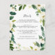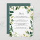 Designed to coordinate with our Alabaster wedding collection, this fresh green botanical and floral guest information card features a border of greenery, foliage and white flowers encircling your key wedding details, like hotel accommodations, welcome reception information, website and more. Add your custom text using the fields provided and use the Customize function to adjust fonts, sizes and spacing.