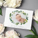 Elegant botanical birth announcements feature your sweet little one's photo (horizontal or landscape oriented) encircled by an oval wreath of lush green foliage and white flowers. Personalize with your baby's name and birth stats beneath.
