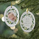 Sweet photo ornament features your little one's photo framed by an oval wreath of green watercolor botanical foliage and white flowers. Personalize the back with your custom caption (shown with "[name's] first Christmas" and the year.