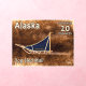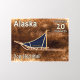 Features the 20 Nugget postage stamp issued by an imaginary independent Alaska commemorating the resumption of dog sled. A modern dog sled is depicted superimposed on a caribou (reindeer) fur background image. The sled has a blue sled bag sporting Alaska's flag and text reading "ALASKA POSTAL SERVICE." Additional text reads, "Alaska," "POSTAGE 20 NUGGETS," and "Dog Sled Mail." You may add your own additional text.