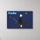 A Bald Eagle scans the sky from his perch on a tree branch; superimposed on a flag of Alaska. Text reading "Alaska" also appears in glowing blue and white.