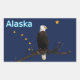 A Bald Eagle scans the sky from his perch on a tree branch; superimposed on a flag of Alaska. Text reading "Alaska" also appears in glowing blue and white.